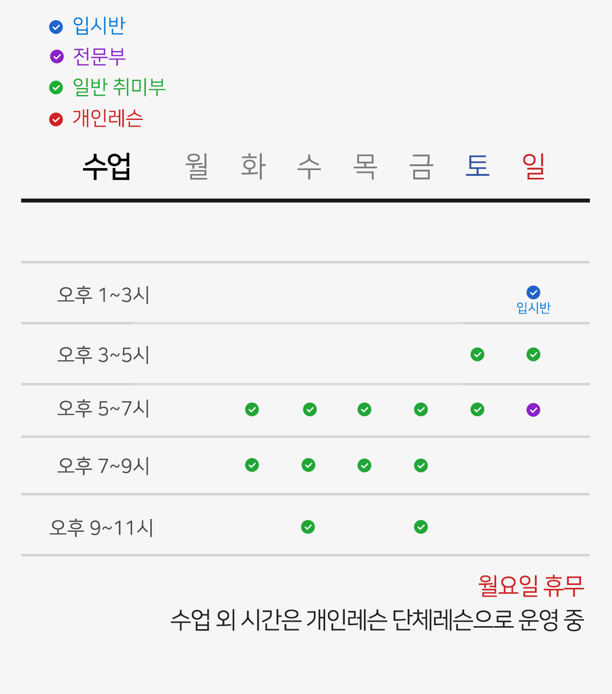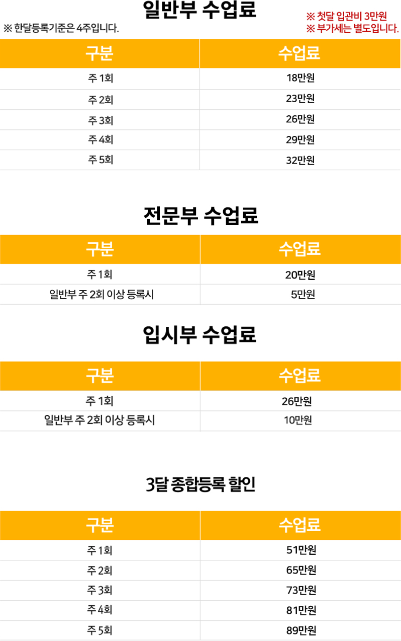 일반취미부, 입시부, 전문부 등 다양한 클래스로